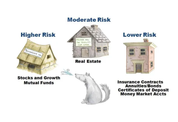 I'll use a little analogy from the children's story of The Three Little Pigs to explain. If you remember, the story details three little pigs being hunted by a wolf who blows the houses of straw and sticks down, but not the house of bricks. The straw house is like stock market values, which get blown away when the hurricanes of volatility rage. The house of sticks is like real estate, which is a little stronger and more predictable, but also shaky in economic turmoil. (There are ways to minimize real estate risk, but that is a topic for another day.)